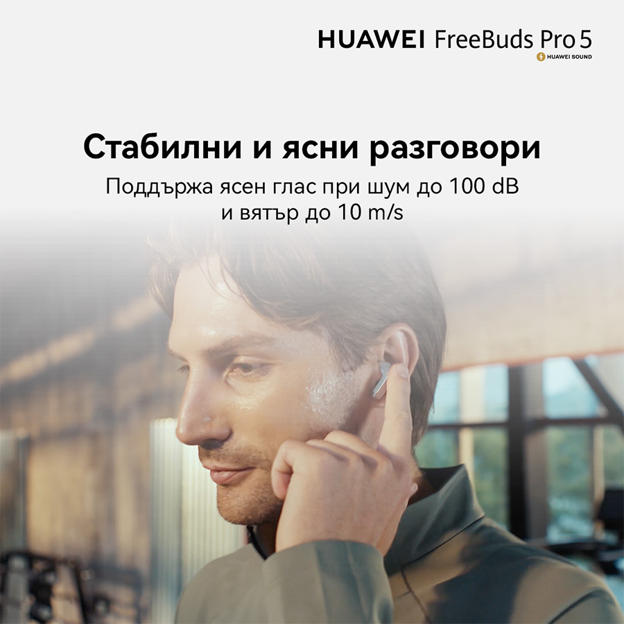 Мощната комбинация от хардуер и софтуер при Huawei FreeBuds Pro 5 осигурява ново ниво на поверителност при разговори. С подобрените възможности на активното шумопотискане се постигат стабилни и ясни двупосочни разговори. Дори при шумна среда до 100dB, слушалките ефективно изолират околните звуци, за да гарантират ясен и отчетлив глас. Уникалният дизайн за намаляване на шума при вятър позволява провеждането на ясни разговори дори при скорост на вятъра до 10 m/s, като гарантира, че и най-тихите думи се предават отчетливо за спокойна и уверена комуникация.