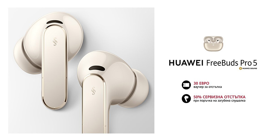За радост на българските потребители Huawei FreeBuds Pro 5 са вече в продажба у нас в Tехнополис, А1, Yettel, Vivacom, верига магазини Зора и партньорската мрежа на дистрибутора Поликомп, която включва - Ozone.bg, Ardes.bg, PLESIO, Laptop.bg, на цена от 199 евро с 30 евро ваучер за отстъпка до 31 март. До една година от датата на закупуване, потребителите могат да се възползват от 50% сервизна отстъпка при загубена слушалка. Моделът се очаква скоро и в Техномаркет.