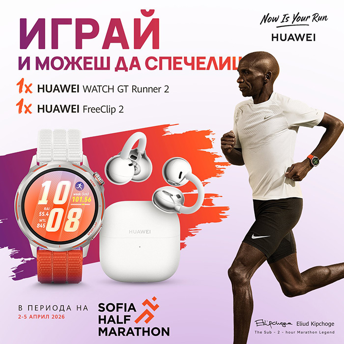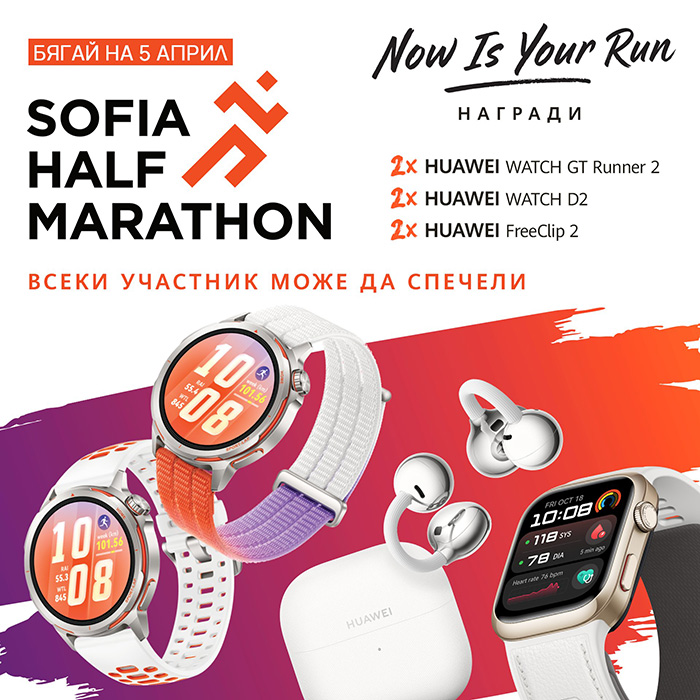 Huawei дава също шанс за награди и на всички гости на маратона, любители на спорта и фенове на марката чрез игра, посветена на Sofia Half Marathon 2026 в Instagram и Facebook профилите на бранда. Можете да се включите в едната или и в двете от тях, за да увеличи шансовете си за награда.