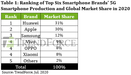 Компанията очаква през тази година да бъдат произведени 1.24 милиарда телефона, а от тях с 5G ще са 235 милиона устройства. Според прогнозата в топ 6 при 5G телефоните ще има 4 китайски производители, но на първо място ще е Huawei с около 74 милиона устройства. Второто място ще е за Apple с около 70 милиона телефона - това са моделите от очакваната през есента серия iPhone 12, които ще получат 5G. TrendForce посочва, че ако компанията реши да увеличи цените това може да се отрази на продажбите.