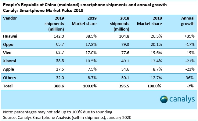 За цялата 2019 година Huawei има доставени 142 милиона смартфона, като това дава на компанията 38.5% пазарен дял, а ръстът спрямо 2018 е с цели 35%. Oppo са доставили 65.7 милиона телефона при дял от 17.8% и спад на годишна база от 17%. Останалите компании в топ пет – vivo, Xiaomi и Apple, са доставили съответно 62.7/38.8/27.5 милиона смартфона.