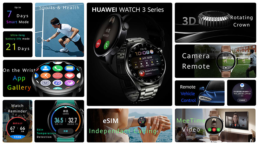 Huawei Watch 3 може да проследява над 100 вида тренировки, а сред тях са 17 професионални режима. Часовникът може да засича падане и да изпрати сигнал за помощ ако потребителят е пострадал.