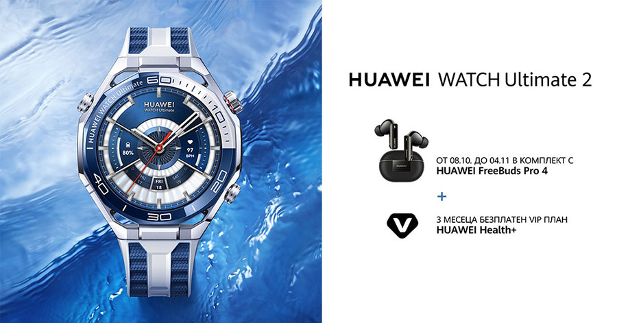 От днес новият Huawei Wаtch Ultimate 2, който е първият смартчасовник със сонарно-базирана подводна комуникация, вече е наличен на българския пазар. До 4 ноември клиентите на А1, Yettel, Vivacom, Technopolis, Техномаркет, Зора и избрани партньори на дистрибутора Поликомп, могат да го закупят в комплект с безжичните слушалки от висок клас Huawei FreeBuds Pro 4 и 3-месечен безплатен достъп до VIP услугата Huawei Health+.