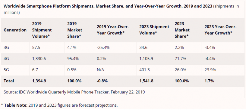 В средносрочен план обаче има поводи за оптимизъм, тъй като IDC предрича обръщане на тенденцията, започвайки от края на 2019. Според компанията от 2020 до 2023 пазарът ще бележи ръст, макар и минимален. През настоящата година се очаква да започнат доставките на 5G смартфони, но в ограничени количества. Към 2023 обаче IDC предвижда, че 1 от 4 доставени устройства ще включва 5G модем.