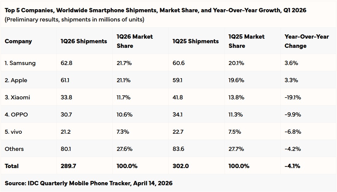 Според предварителни данни на IDC, глобалните доставки на смартфони са спаднали с 4.1% на годишна база до 289.7 млн. бройки през първото тримесечие на 2026. Това прекъсна серията от 10 поредни тримесечия на растеж.