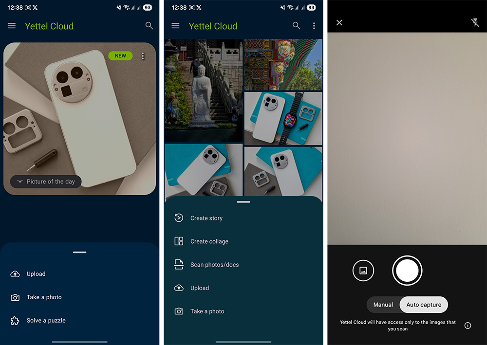През бутона за качване на съдържание в приложението получавате директен достъп и до камерата на телeфона, а снимката автоматично се запазва в облака. Този бутон включва и забавна игра, превръщаща ваша снимка в пъзел, който трябва да подредите. Има дори възможност да предизвикате приятели със същия пъзел, като им изпратите връзка към него. Други опции включват създаване на колажи с различни шаблони и дори сторита с музика, които могат да бъдат споделени като видео. Изтритите файлове пък отиват в кошче, в което могат да престоят до 30 дни преди окончателно унищожаване.