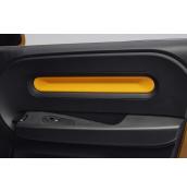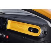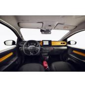 Изтеклите изображения ни дават и първи поглед към интериора на Twingo, който отново изглежда много близък до този на концептуалния модел. Има два големи екрана, ред физически бутони за климатичен контрол, голям бутон за аварийна светлина – още едно препратка към оригиналния Twingo – и яркожълт панел на таблото, който добавя цвят към иначе черния (вероятно с много пластмаса) интериор.