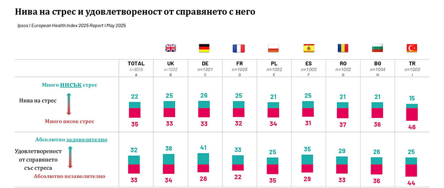 Въпреки че здравословният начин на живот често се свързва с физическа активност, темата за стреса остава недостатъчно разглеждана. Проучването показва, че 36% от българите съобщават за високи нива на стрес – едно от най-високите нива в Европа. Само 26% от анкетираните се чувстват удовлетворени от способността си да се справят със стреса, а 38% са неутрални. Знанието за налични технологични решения е ниско – едва 4% от населението знае, че смартчасовниците могат да измерват нивата на стрес.