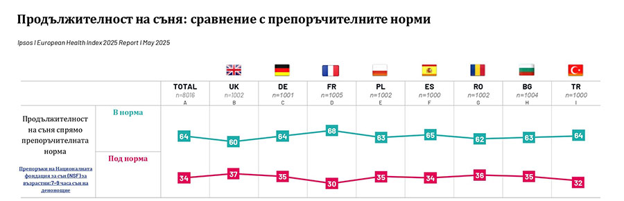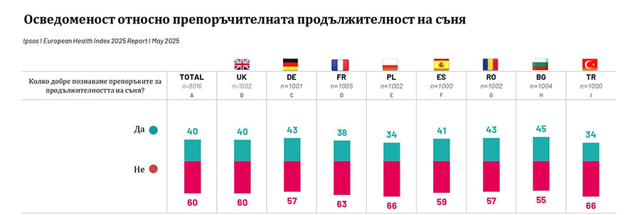 Сънят също е засегнат от липса на информираност. Цели 55% от българите не знаят каква е препоръчителната продължителност на съня според международните здравни стандарти. Жените показват по-високо ниво на осведоменост по темата, но също така са по-склонни да страдат от недоспиване. 35% от анкетираните спят под препоръчителните 7–9 часа, като този дял нараства с възрастта.