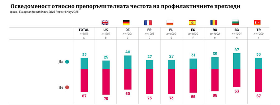 Изследването откроява и високи нива на несигурност по отношение на профилактичните прегледи. Макар българите да показват най-висока информираност сред всички изследвани държави, 53% все още не знаят препоръчителната честота на профилактика.