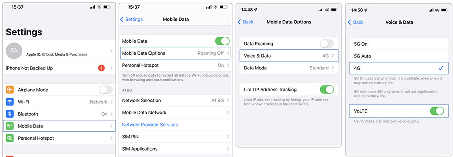 Ако имате по-стар модел iPhone, в който конфигурирането на VoLTE не става автоматично, можете да направите следното. Отворете Settings, след това изберете Mobile Data –> Mobile Data Options –> Voice & Data. След това изберете 4G и активирайте бутона VoLTE.