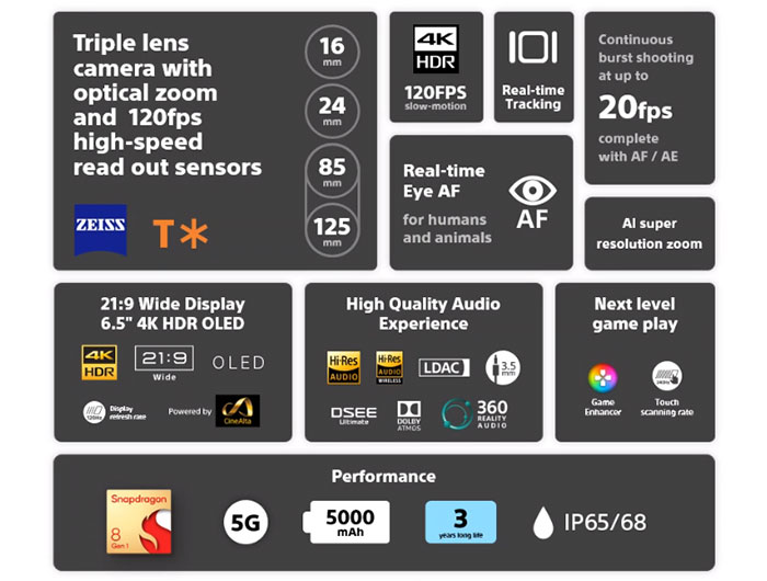 В хардуерно отношение откриваме флагмански чипсет Snapdragon 8 Gen 1, който осигурява достъп до 5G и Wi-Fi 6E безжични възможности, а към него са добавени 12 GB RAM и 256 GB разширяема памет за файлове. Както стана дума батерията е с капацитет 5000 mAh, а според Sony има удължен живот до 3 години. Батерията поддържа бързо зареждане при 30 вата, а освен това може да се зарежда и безжично.