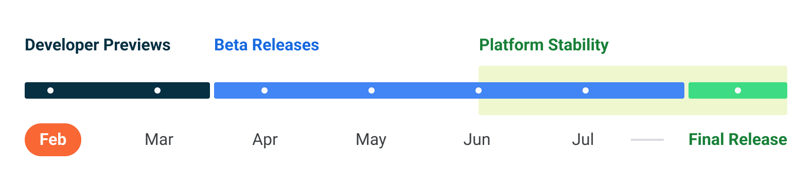 От компанията споделят и графика за разработка преди пускането на финалната версия. Той показва, че е планирана още една версия за разработчици през март. След това ще има четири бета версии, две в платформена стабилност, през юни и юли. Ако процесът върви гладко финалната версия на Android 13 ще се появи около август.