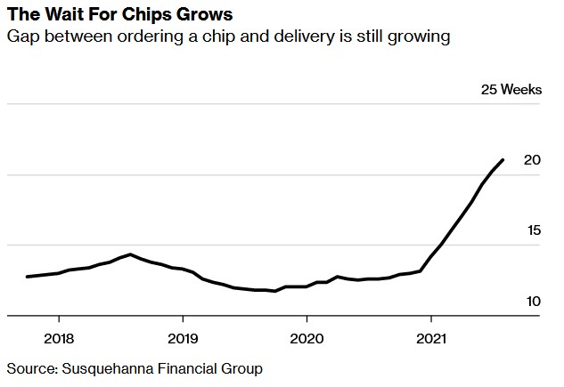 Според доклад на Susquehanna Financial Group кризата се е задълбочила от юли, като средното време за изчакване за доставка на чипове е с 6 дни повече. Към август разликата между подаването на заявка от страна на дадена компания и получаването на доставките на чипове е 21 седмици.
