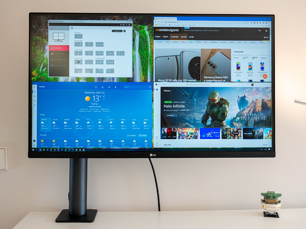 Иначе всички аспекти на монитора можете да управлявате и през приложението на LG, което поддържа разделяне на екранната площ в различни конфигурации, промяна на цветовия профил, обновяване на софтуера на устройството и още.
