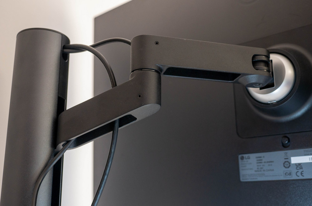 По подразбиране LG 32UN880 идва в комплект с ергономична стойка, която включва скоба в долната част за фиксиране към плота на маса или бюро. Тя поддържа плотове с дебелина до 90 мм чрез преместване на един от елементите й, така че е добре да обърнете внимание на указанията в инструкцията за монтаж.