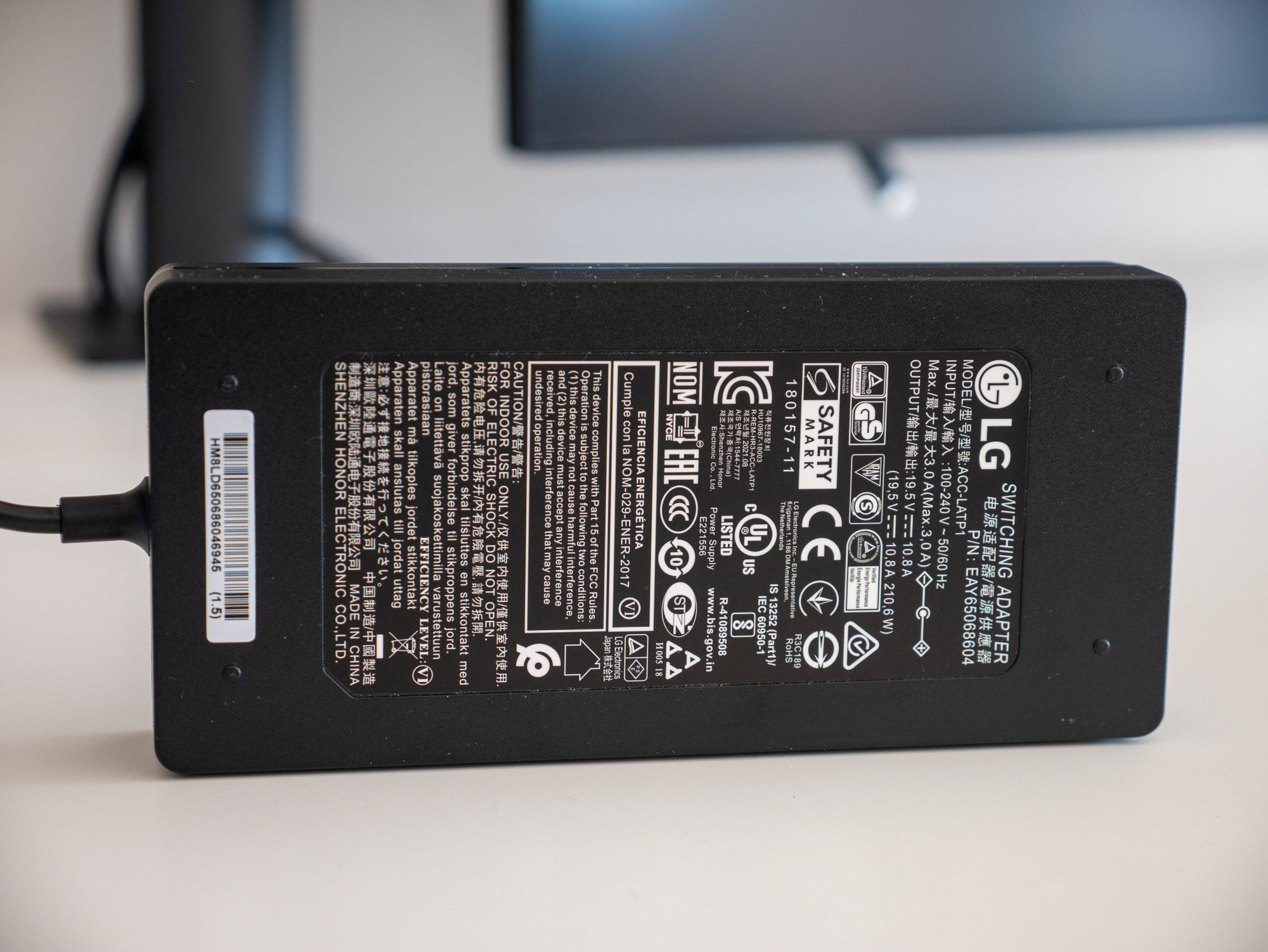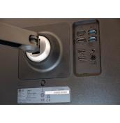 В комплекта получавате HDMI 2.0 и USB-C към USB-A кабели, масивен захранващ адаптер и удължаващ кабел към него. Всички интерфейси за връзка са поставени близо до средата на задната част, което е разбираемо предвид подвижността на стойката. Там са жак за слушалки, 2 броя HDMI, DisplayPort, 2 downstream USB 3.0 и един USB-C порт. Последният може да се ползва за трансфер на данни и показване на видеосигнал от свързан лаптоп и е в състояние да го зарежда с мощност около 60 вата.