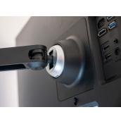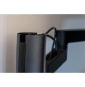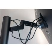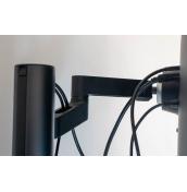 След като фиксирате стойката, трябва просто да извадите монитора от опаковката и да го монтирате върху нея, което става много лесно. Трябва само да се убедите, че е щракнал на мястото си. После е време да прекарате всички кабели през съответните канали и отвори в стойката и е важно да го направите според указанията заради подвижността на монитора.