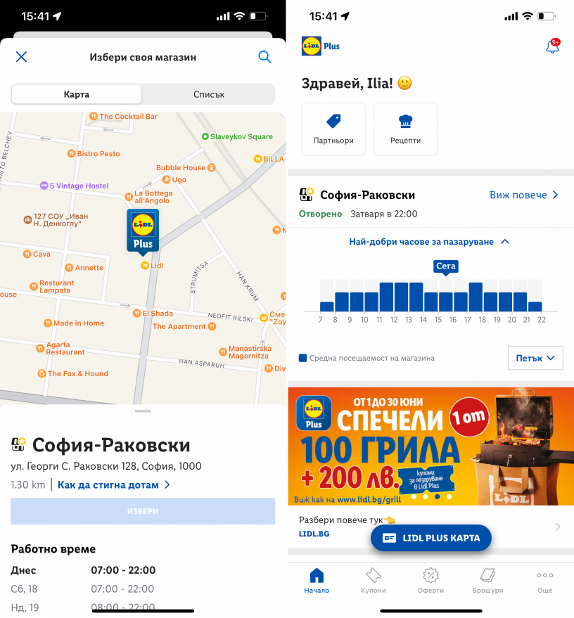 Ако има нещо, което да прави пазаруването по-стресиращо, това е да се случва в претъпкан магазин. Затова любимата ми функция на Lidl Plus е секцията “Най-добри часове за пазаруване”. Тя е на началната страница, където можете да изберете да се визуализира магазинът Lidl, който посещавате най-често.