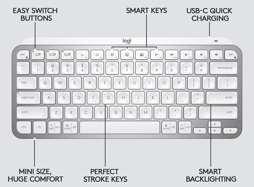 Logitech представи новата си безжична и компактна клавиатура MX Keys Mini. Тя представлява умален вариант на оригиналната MX Keys, като е премахнат цифровият блок. Запазена обаче е системата Perfect Stroke, която комбинира немеханични суичове с вдлъбнати клавиши за подобряване на точността при писане.