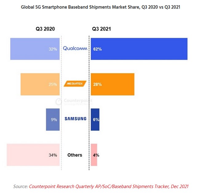 Компанията за пазарни анализи Counterpoint Research публикува данни за доставките на мобилни чипсети през третото тримесечие на 2021. Информацията сочи, че MediaTek разширява преднината си пред Qualcomm, както и възход на Unisoc.