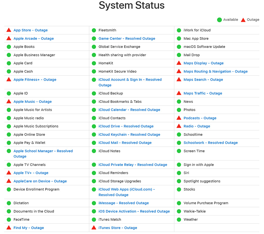 Според Bloomberg Apple е уведомила служителите, че проблемите се дължат на DNS, но е отказала да коментира ситуацията. Компанията потвърди за прекъсването в своя сайт, който показва затруднения в ползването на повече от 10 услуги, включително App Store, Arcade, Fitness+, Music, Maps, iTunes Store, TV+, Podcasts и още. По данни на Downdetector първите оплаквания са започнали около 18 часа с пик около 19 часа и в момента ситуацията изглежда се подобрява.