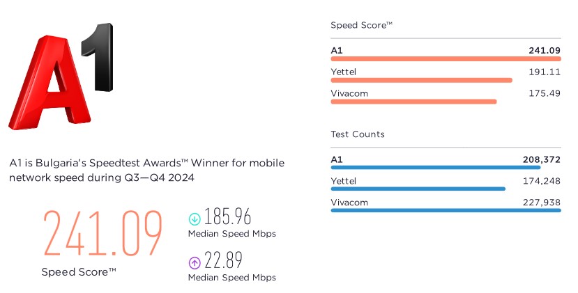 По данни на Ookla Speedtest мобилната мрежа на А1 е била най-бързата в страната в периода юли-декември 2024 година. Компанията е постигнала най-висок SpeedScore, най-бърза скорост на сваляне на данни и най-ниска латентност сред трите телекома в страната за втора поредна година. Изследването на Ookla показва, че А1 заема челна позиция с оценка Speed Score 241,09, медианна скорост на сваляне 185,96 Mbps и медианна латентност 17 ms.