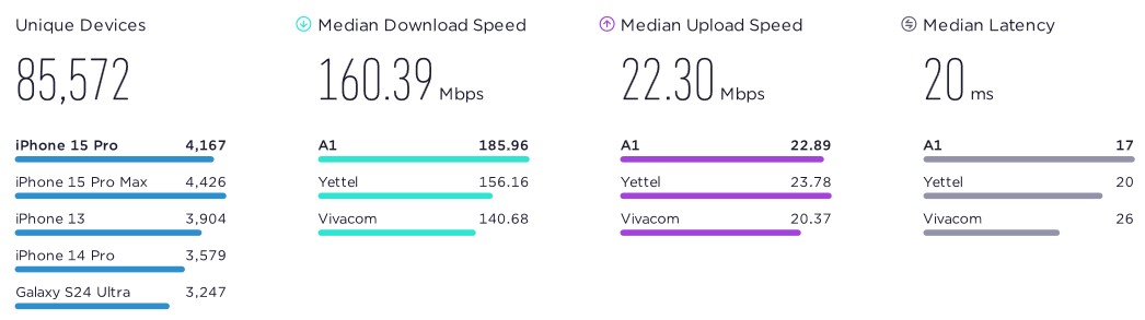За сравнение оценките SpeedScore на другите телекоми са 191,11 за Yettel и 175,49 за Vivacom. Прави впечатление, че при медианната скорост на изпращане на данни на първо място е Yettel с 23,78 Mbps, а A1 остава на второ с 22,89 Mbps. За определянето на носителя на Speedtest Award за най-бърза мобилна мрежа Ookla анализира резултатите от тестовете, направени със смартфони, независимо кое поколение мрежа са използвали.