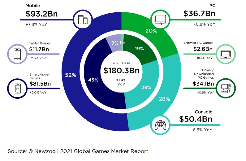 От десетилетия пазарът за видеоигри е доминиран от конзолите и компютрите, но с по-широкото навлизане на смартфоните, това постепенно се промени. В днешно време над 6 милиарда човека притежават мобилен телефон и без изненада мобилният гейминг е отговорен за над 52% от приходите от целия пазар.