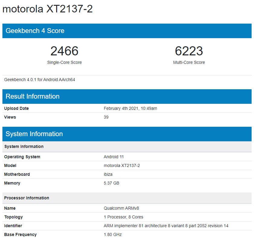 Благодарение на това научаваме, че устройството ще е базирано на чипсет Snapdragon 480, което означава, че ще има 5G свързаност. Резултатите му са 2466 и 6223 точки съответно в едноядрения и многоядрения тест на Geekbench 4.