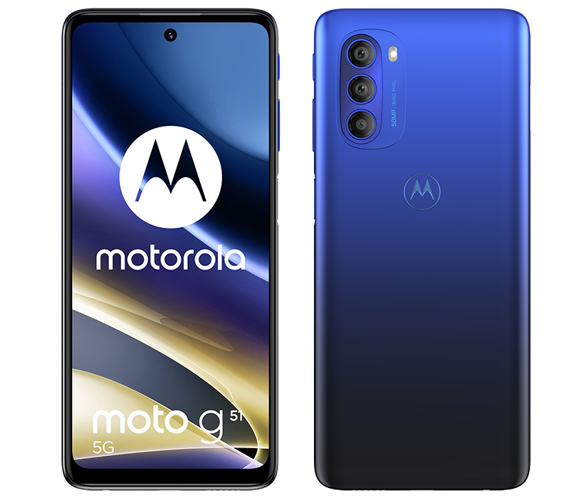 Moto g51 5G също поддържа 5G мрежи благодарение на чипсета Snapdragon 480 Pro. Той е допълнен от 4GB RAM и 64GB разширяема памет за файлове, но в други региони ще има варианти с 6/8GB RAM и 128GB памет. Моделът включва 6.8" FHD+ LCD дисплей с опресняване при 120 Hz и тройна камера с 50МР главен сензор като в moto g51 5G. Камерата за селфита е 13МР.