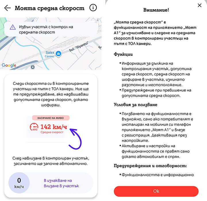 Показва се и предупреждение, ако превишите допустимата средна скорост. След навлизане в контролиран участък отчитането на средната скорост ще започне автоматично. В приложението се уточнява, че функционалността е информационна, а активирането й и извършването на настройки могат да се правят само при спрял автомобил. Новата опция може да се ползва само от потребители на A1, които са инсталирали в телефона си приложението “Моят А1” и се впишат в него със своята регистрация.