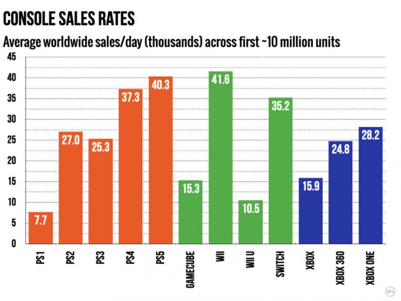Друг важен елемент изглежда е и колко е стара конзолата. От графика на ArsTechnica, която показва дневните продажби за първите 10 млн. продадени бройки, се вижда, че по-новите конзоли се справят по-добре. Това е напълно логично, тъй като цялата гейминг индустрия бележи забележителен ръст в последните десетилетия.