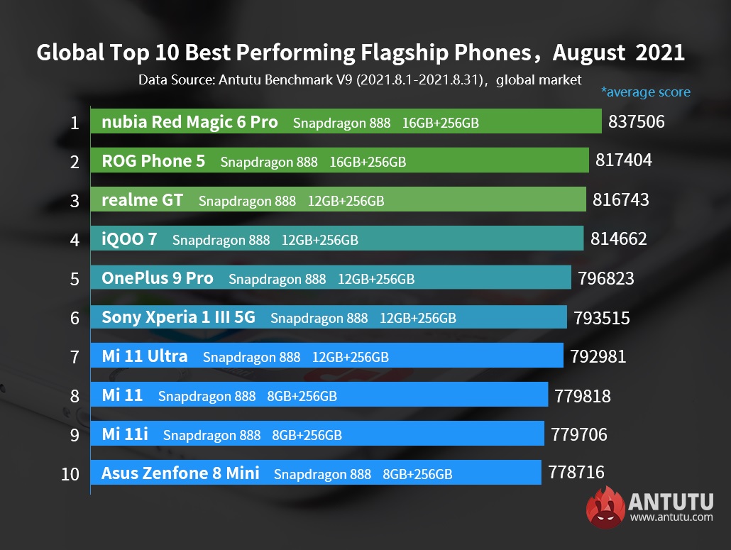 Лидер е nubia Red Magic 6 Pro с 837 506 точки, а в челната тройка са още ROG Phone 5 с 817 404 точки и realme GT с 816 743 точки. Петицата допълват iQOO 7 и OnePlus 9 Pro. В класацията са още Sony Xperia 1 III 5G, Xiaomi Mi 11 Ultra, Mi 11, Mi 11i и Asus Zenfone 8 Mini.
