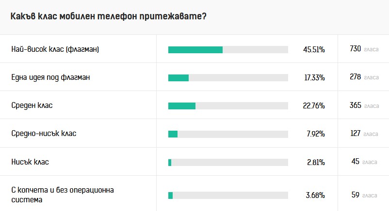 Най-много от вас (730 гласа/45.51%) посочват, че притежават премиум „модел от най-висок клас (флагман)“. Сред актуалните попълнения в този клас можем да отличим Samsung Galaxy S22 Ultra, Galaxy Z Fold3, Apple iPhone 13 Pro Max, Huawei P50 Pro и т.н.