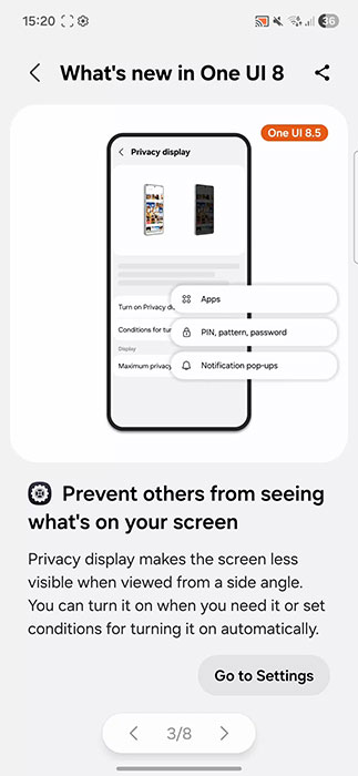 Samsung все още не е обявил функцията „Private Display“, нито е споменал или дал подробности за следващата версия One UI 8.5. Като се има предвид, че функцията „Private Display“ има някои хардуерни изисквания, а именно технологията Flex Magic Pixel на Samsung Display, тя може да остане ограничена до по-нови устройства, като Galaxy S26 Ultra, според изтеклите информации.