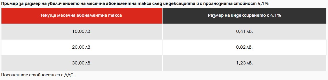 Увеличението ще бъде с ИПЦ за 2020 и 2021 година. За миналата година този показател е бил 1.7%, а за тази ще бъде обявен през януари. A1 посочва, че се очаква той да бъде 2.4%, така че сумарното индексиране ще бъде с 4.1%. Това означава, че месечна такса от 30 лв ще бъде индексирана с 1.23 лв.