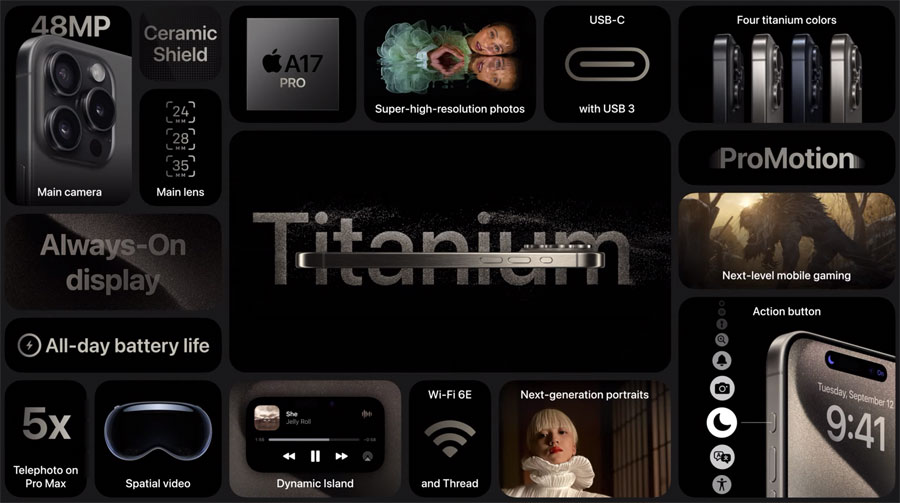 Новите телефони предлагат и Action бутон на мястото на познатия слайдер за звука – това е програмируем бутон, чиято функция може да се промени според предпочитанията, макар че по подразбиране е запазена старата му функция. Смартфоните разполагат със Super Retina XDR дисплеи с ProMotion и поддържат функциите always-on display и новия режим StandBy в iOS 17.