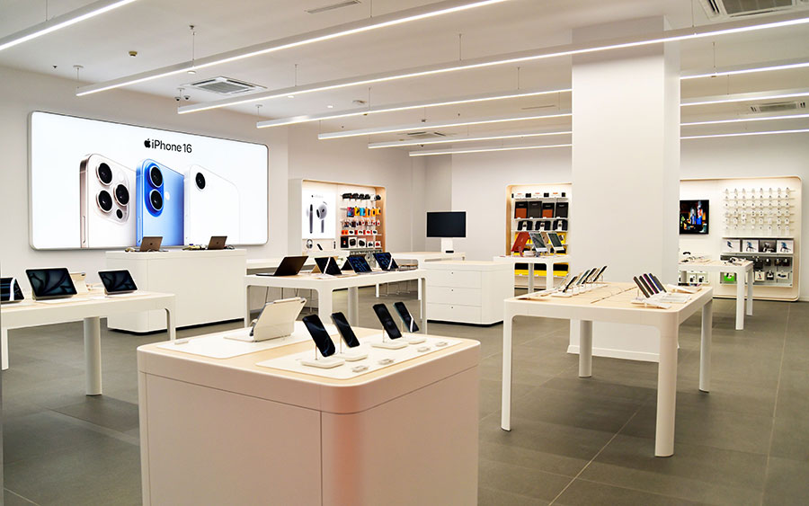 Създаден по последните стандарти на Apple, магазинът предлага модерен, просторен интериор с оригинални дизайнерски елементи, а клиентите могат свободно да тестват всички устройства. Излагането на продуктите е с приоритет – затворените витрини са сведени до минимум, така че всеки да може да изпробва продуктите свободно на отворени щандове.