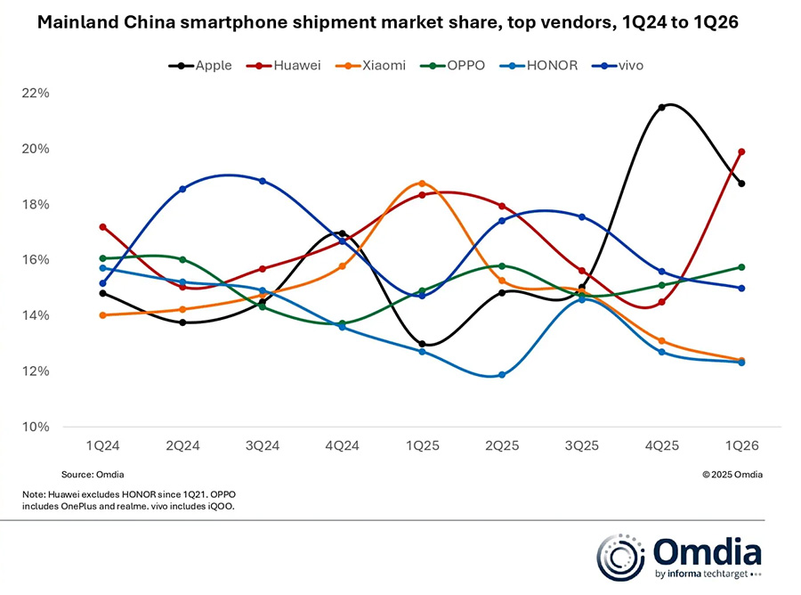 През първото тримесечие на 2026 г. общият пазарен дял на шестте водещи производители – Huawei, Apple, Xiaomi, Oppo, Vivo и Honor e достигнал 94%. Водещите производители имат предимства в областта на веригите за доставки, научноизследователската и развойна дейност, операционните системи и услугите, екосистемите и дистрибуцията. Тъй като нарастващите разходи за памети продължават да оказват натиск, Omdia прогнозира, че пазарът на смартфони в Китай ще се свие с 10% през 2026 г.