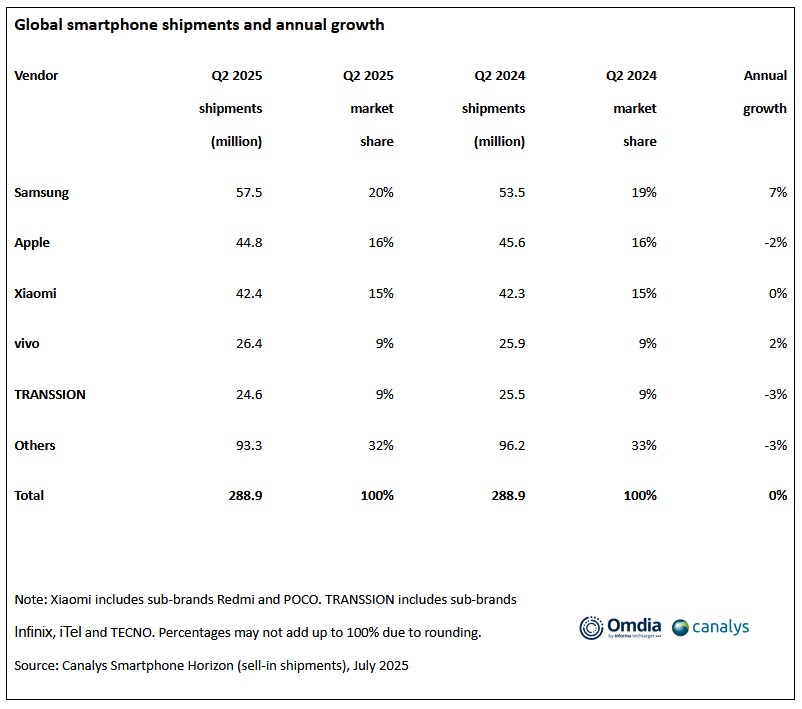 Според най-новите пазарни проучвания на Canalys (част от Omdia), глобалните доставки на смартфони са спаднали леко до 288,9 милиона броя през второто тримесечие на 2025 г., тъй като скромното потребителско търсене е ограничило растежа на пазара.