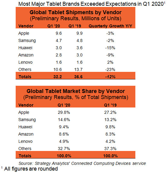 Пандемията се отразява сериозно и на технологичния сектор заради централното място на Китай в производството на много продукти и компоненти. Таблетите не правят изключение, както става ядно от данни на Strategy Analytics за първото тримесечие на годината. Цифрите на компанията показват, че за периода доставките са намалели с 12% на годишна база до 32.2 милиона броя, но SA посочва, че това всъщност е по-добър резултат от очакваното.
