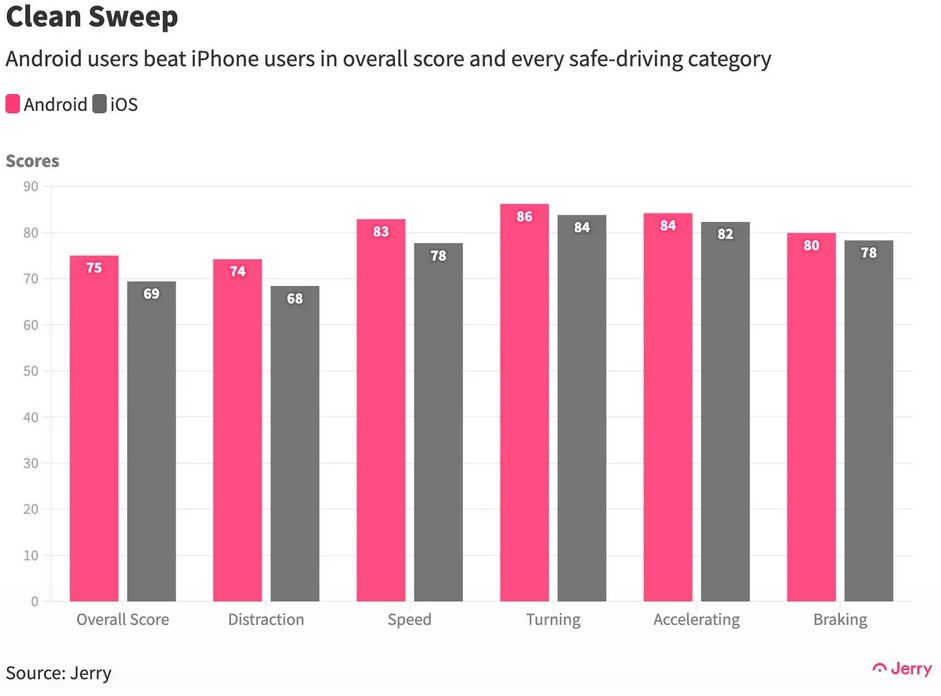 Проучване на автомобилната застрахователна компания Jerry, проведено в САЩ, може да засили противопоставянето между потребителите с Android и iPhone/iOS. От компанията са анализирали навиците при шофиране на 20 000 човека за общо 13 милиона километра.