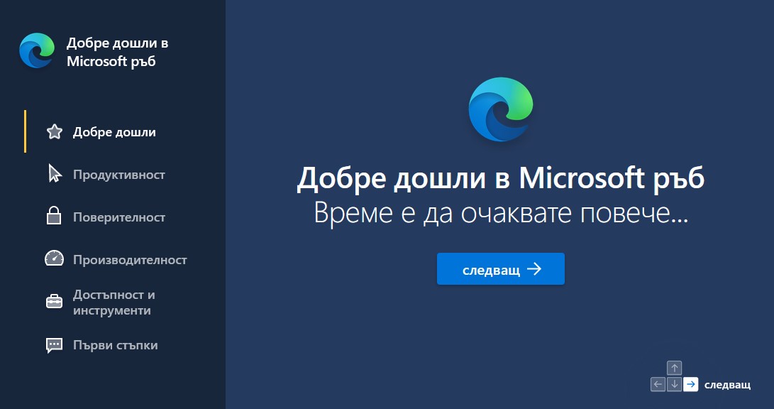 Това впечатление оставя началната страница на браузъра Microsoft Edge в сайта на компанията, която приветства потребителите и им помага да започнат работа с приложението. "Добре дошли в Microsoft ръб", топло посреща тя. Моля? Премигвам изненадано и виждам големия надпис, който продължава с "Време е да очаквате повече".