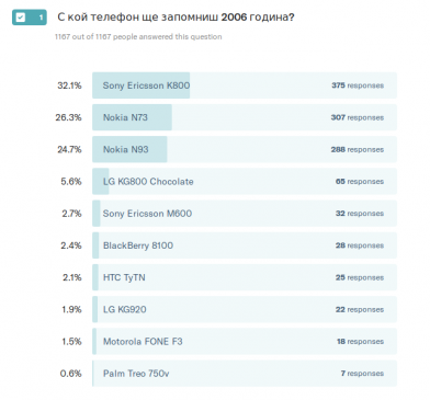 Поредната седмица с поредната награда по повод 15-ия рожден ден на Mobile Bulgaria. Миналата седмица ви представихме най-интересното от 2006 и ви попитахме с кой телефон ще запомните годината. Отговорите ви посочиха, че това безспорно е Sony Ericsson K800. Ето и пълната класация:
