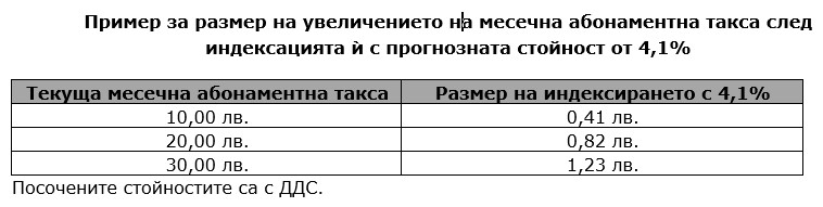 В интерес на потребителите сме решили индексацията с индекса за 2020 година да бъде реално отразен в месечните сметки на абонатите през първото тримесечие на 2022 година, заедно с индексацията за 2021 г. По този начин ще бъде избегнато неудобството от две последващи промени в сметките. Друго предимство на този подход е, че месечните абонаментни такси ще бъдат индексирани на по-ниска база спрямо индексацията в две различни години и съответно крайното увеличение ще бъде по-малко за клиентите. (Моля, вижте таблицата в края на документа с прогнозното увеличение, ако сумарният средногодишен индекс за 2020 и 2021 година е 4,1%).