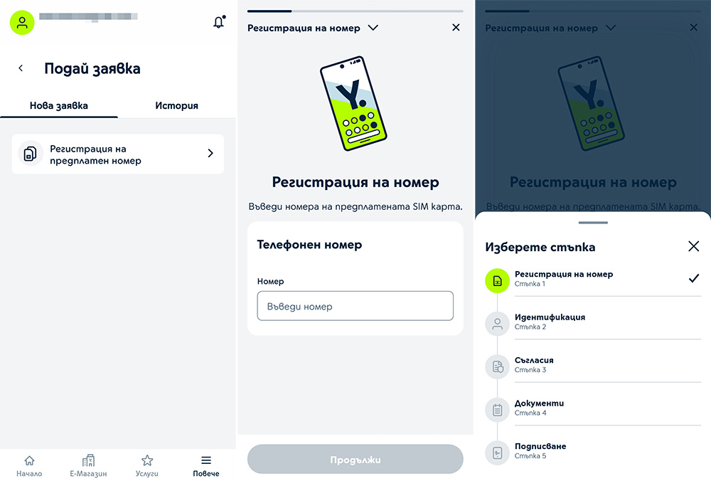 При получаване на картата следва да регистрирате предплатения номер – също изцяло дигитално. От раздел „Повече“, разположен в дясната част на долната навигационна лента, избирате меню „Подай заявка“, а след това „Регистрация на предплатен номер“. След въвеждане на номера на SIM картата започва процесът по цифрова идентификация чрез Yettel ID, който включва заснемане на селфи и снимка на личната карта. Регистрацията се финализира с електронно подписване след преглед на документите и даване на необходимите съгласия. А предплатеният номер се активира автоматично с първото изходящо обаждане, изпратен SMS или осъществена интернет сесия.