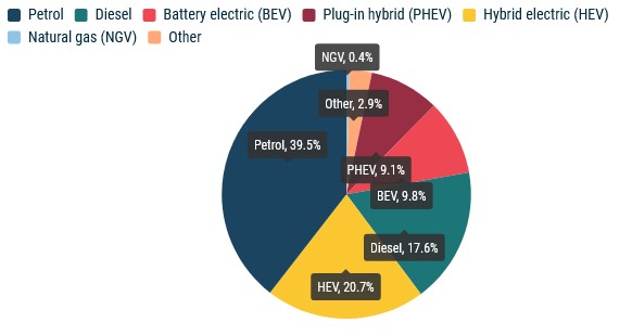 Регистрациите на хибридни електрически автомобили са 20.7% от общия европейски пазар и така на практика за първи път са изпреварили тези на дизелови (17.6%). Между юли и септември конвенционалните автомобили с ДВГ са продължили да губят позиции. Продажбите на бензинови са се свили с 35.1% до 855 476 броя, а пазарния дял е достигнал 39.5% при 47.6% преди година.