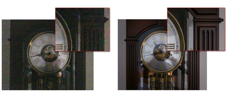 Снимка от iPhone при намалена осветеност и снимка от Indigo, която комбинира 32 кадъра.