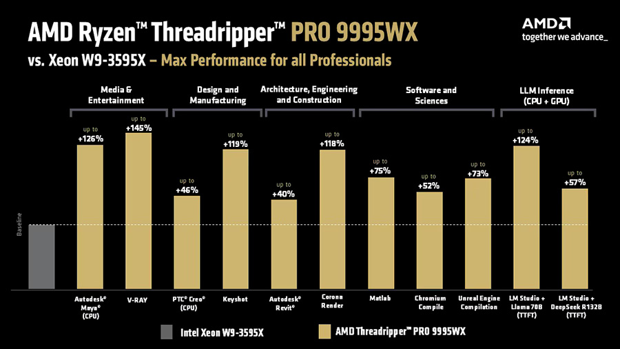 Те са специално създадени за професионалисти и бизнеси, които изискват производителност, надеждност и разширяемост от най-високо ниво и осигуряват несравнима многоядрена производителност. При сравнения с фиксирана честота с предшественика си, Threadripper PRO 7000, се наблюдава повишение на IPC от 16% в основните бенчмаркове за работни станции - и до 25% в бенчмарка SPECworkstation 4.0 за AI и ML1. При сравняване на новия флагмански 96-ядрен процесор Threadripper PRO 9995WX с предишното поколение PRO 7995WX, е налице дори до 26% по-висока производителност. Това се основава на широк набор от смесени натоварвания в реалния свят във всяка основна вертикална област.